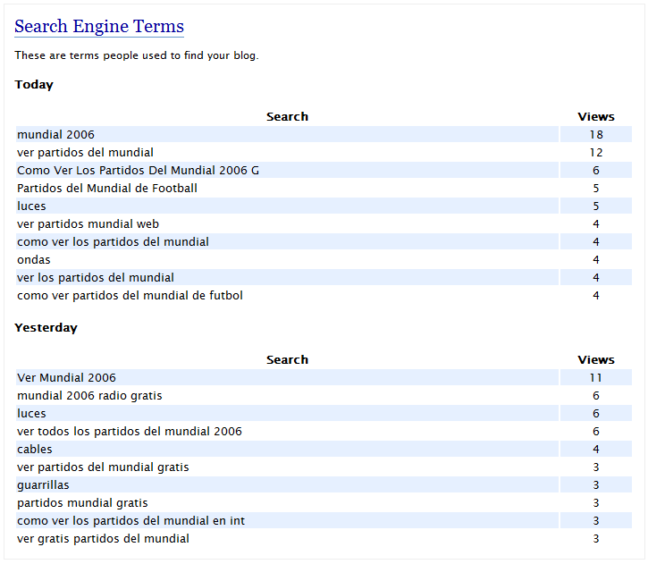 Muy fácil: basta mirar las búsquedas que han traido gente al blog en éstos días, en concreo al post sobre como ver los partidos del Mundial de alemania 2006 gratis por la web: